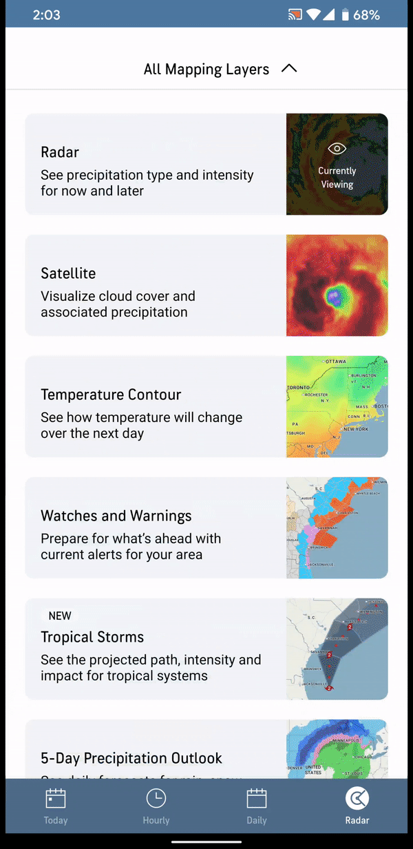 En la pestaña “Radar”, ahora puedes ver la trayectoria proyectada de una tormenta, la lluvia esperada, el viento y la marejada ciclónica, así como un riesgo para la vida y la propiedad. Como se ve en la imagen a continuación, se puede acceder fácilmente a cada una de las diversas capas en la misma sección de la aplicación. Sin embargo, no hay tormentas en este momento, por lo que no está totalmente claro cómo se verá la IU.