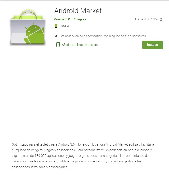 La página para Android Market todavía está disponible en play.google.com/store/apps/details?id=com.google.android.finsky , y la descripción aparentemente no se ha tocado en casi una década. Tampoco hay capturas de pantalla en absoluto. Aquí está la descripción completa: