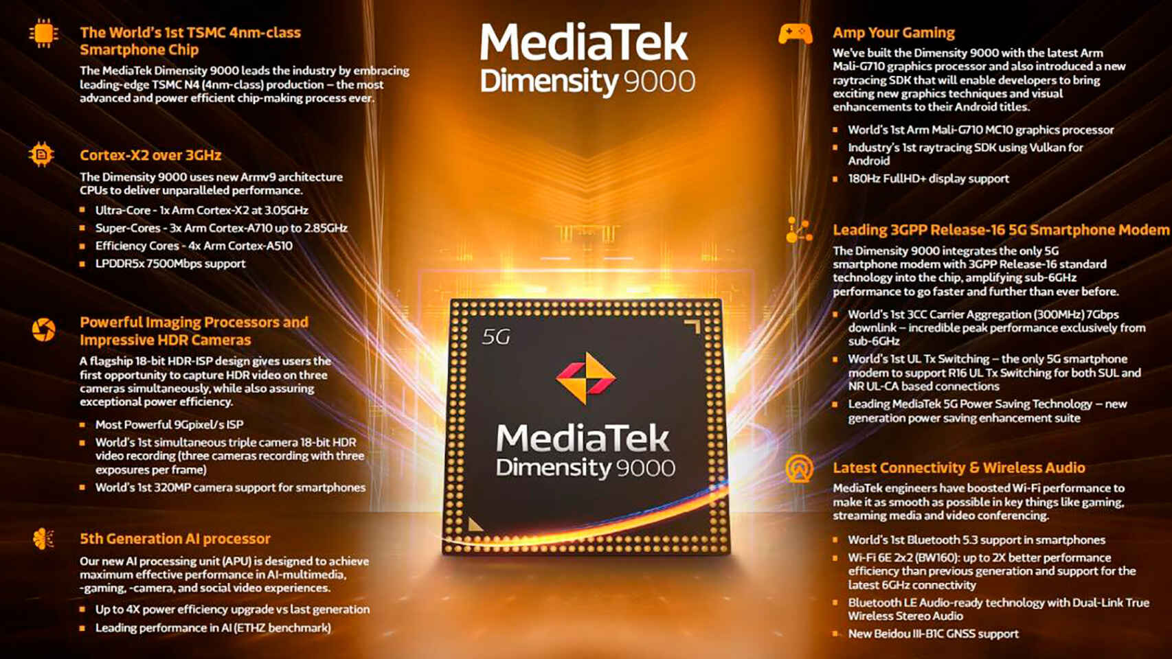 La lista de mejoras no termina aquí. MediaTek Dimensity 9000 es el primer conjunto de chips que brinda compatibilidad con Bluetooth 5.3 en teléfonos inteligentes, lo que brinda cambios evolutivos en el rendimiento del dispositivo. Además, la compatibilidad del chip con Wi-Fi 6E promete una eficiencia de rendimiento hasta 2 veces mayor. El nuevo soporte GNSS Beidou III-B1C también está presente, además de la tecnología lista para audio Bluetooth LE que proporciona audio estéreo inalámbrico verdadero de doble enlace. Eso no es todo, al igual que Dimensity 1200, MediaTek también ofrecerá la arquitectura de recursos abiertos Dimensity para su chipset insignia, lo que permitirá a los fabricantes de teléfonos introducir teléfonos inteligentes personalizados.